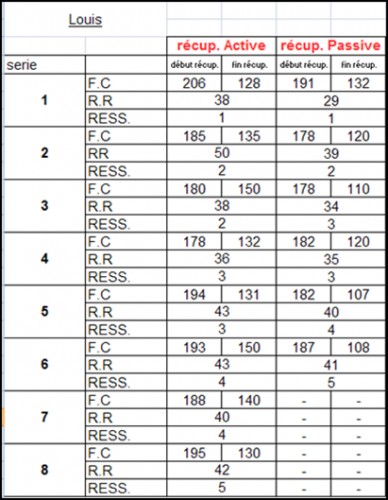 -Pendant le temps de récupération: Les coureurs ont plusieurs choses à prendre en note dans leurs tableaux: d'une part, ils notent leur fréquence cardiaque dès la fin de chaque série et juste avant la série suivante afin d'évaluer ses variations durant le temps de repos. D'autre part, ils doivent compter leur rythme cardiaque grâce au nombre d'inspirations/expirations durant la minute de récupération. Enfin, les coureurs notent leur ressenti à la fin de chaque série, sur une échelle de 1 à 5, selon leurs sensations éprouvées: